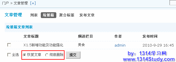 在门户发布的文章,管理员可以在后台进行统一管理。同时管理人员也可以直接在后台发布文章、删除文章、改变相册的分类、编辑文章、恢复已经放入垃圾箱中的文章、设置聚合标签的显示名称等。