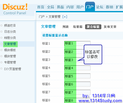 聚合标签是 Discuz! X1.5 新增加的功能,文章内置了 8 个标签,在文章类模块调用数据时可以通过指定标签来聚合文章,同时可以为这 8 个标签设定显示名称。