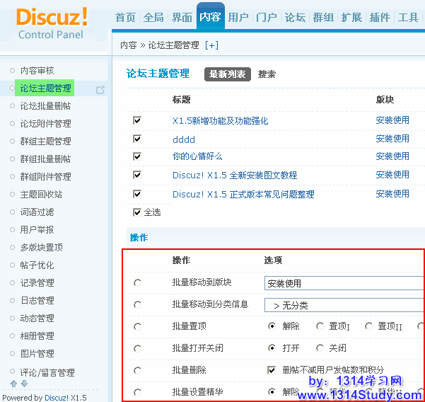 Discuz! X 1.5应广大站长要求,在后台管理中增加了对内容的批量管理功能,不仅可以批量管理论坛,还根据跨界融合的产品特点,加入了对群组、家园的用户各种动态的批量操作,帮助站长减轻站点用户量和用户活跃度提升所带来的压力。