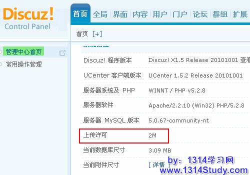 2)允许发布附件:设置是否允许上传附件到没有设置特殊权限的论坛中。需要 PHP 设置允许才有效,请参考管理中心首页如下图所示: