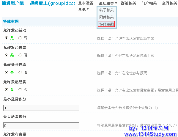 4)允许发起悬赏:选择“是”允许在论坛发布悬赏主题,悬赏使用交易积分。