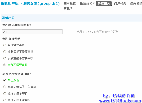 与之前版本不同的是 Discuz! X1.5 群组相关设置中增加了发帖审核和是否允许发站外URL的设置。