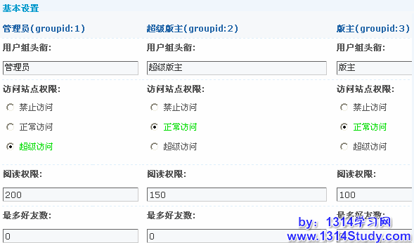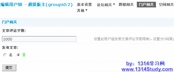 1)文章评论字数:设置此管理组发表文章评论字数限制,设置为0将禁止此用户级发表评论。