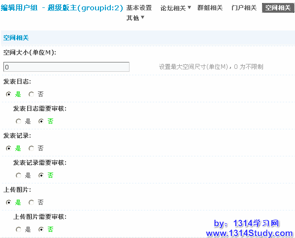 2)发表日志:是否允许在个人空间中发布日志,选择“是”则可以设置发表日志是否需要审核。