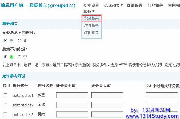 3)允许参与评分:允许该管理组用户在给其他用户评分的时候可以评哪种积分,以及可以评分的最大值与最小值,和24小时评分总量。