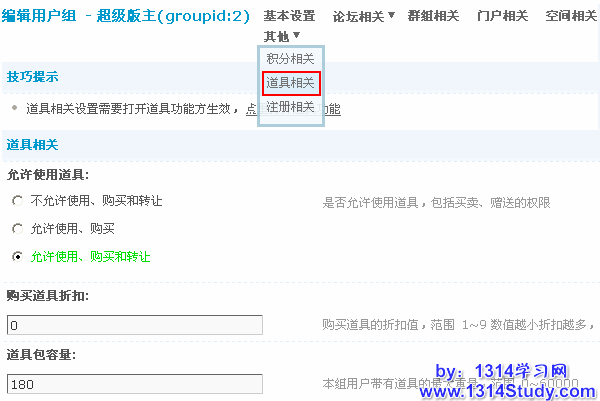 1)允许使用道具:是否允许使用道具,包括购买、使用、转让的权限。
