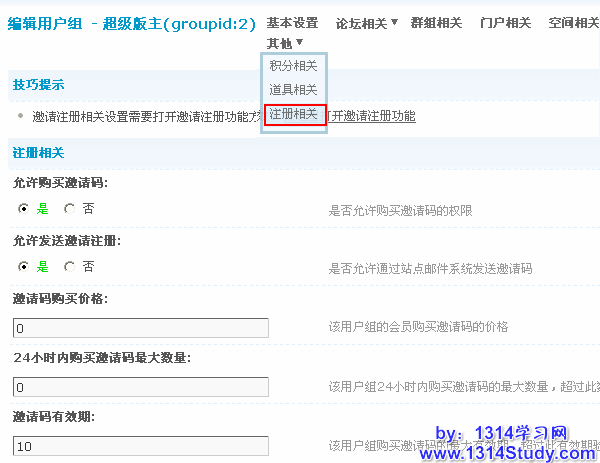 2)允许发送邀请注册:是否允许通过站点邮件系统发送邀请码。
