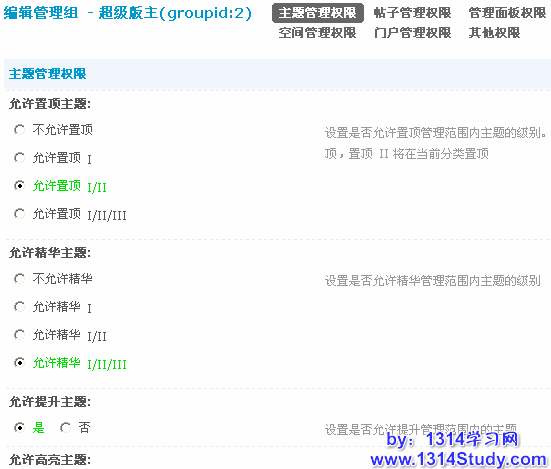 2)允许精华主题:设置是否允许精华管理范围内主题的级别。