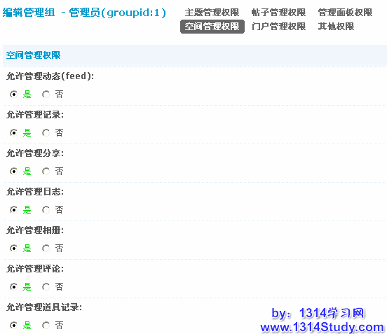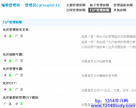 5)允许被授权管理DIY模块:设置是否允许管理员给此管理组分配管理DIY模块的权限,包括首页、频道、专题、文章、空间、论坛等页面的权限,需进入门户 => 模块管理和DIY页面管理进行分别设置。