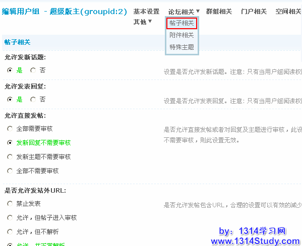 1)允许审核帖子:设置是否允许审核用户发表的帖子,只在站点设置需要审核时有效。