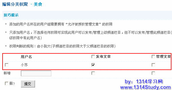 点击频道栏目后的“权限”链接即可添加对该频道中文章有管理权限的用户,添加的用户名所在的用户组需要拥有“允许被授权管理文章”的权限。