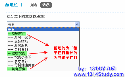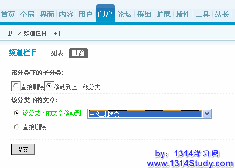点击根频道栏目右边的删除链接可以直接删除该频道或者选择将该频道下的分类直接删除或者移动到上一级分类。该分类下的文章也可以直接删除或者移动到其它分类下。