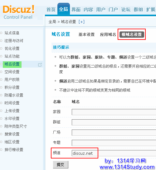 设置频道的根域名,设置好此处的域名后就可以在频道处设置二级域名,如下图所示