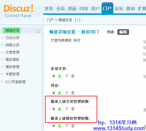 继承上级模块管理权限:选择“是”继承上级模块管理权限,包括页面DIY权限和模块管理权限。