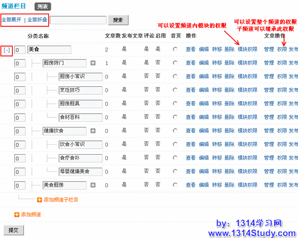 点击频道右边的管理链接编辑频道下的文章,也可以移入垃圾箱、移动到其它分类下,更详细的说明在“文章管理”中。