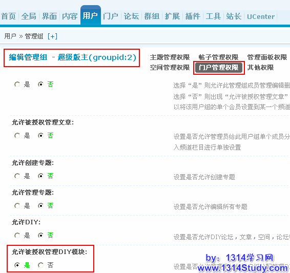 操作路径:【后台】=>【用户】=>【管理组】=>选择有该频道模块管理权限的用户组,点击“管理权限”=>“门户管理权限”允许被授权管理DIY模块,选择“是”