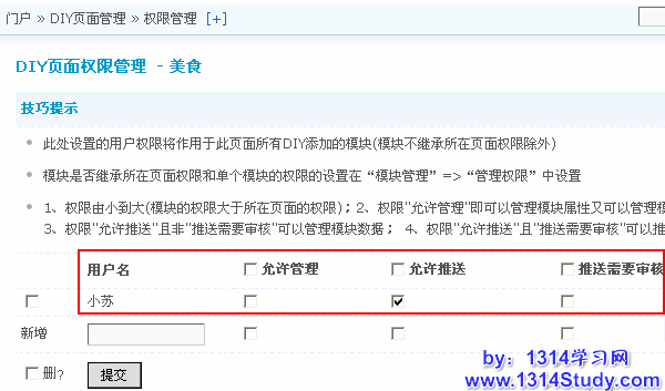 点击频道栏目后的“模块权限”链接即可添加对该频道模块有管理权限的用户,这里的用户权限将作用于此页面所有DIY添加的模块(模块不继承所在页面权限除外)