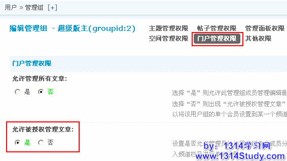 操作路径:【后台】=>【用户】=>【管理组】=>选择有该频道文章管理权限的用户组,点击“管理权限”=>“门户管理权限”允许被授权管理文章,选择“是”
