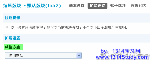操作路径:【后台】=>【论坛】=>【版块管理】=>【编辑版块中】=>【扩展设置】=>风格方案中选择该版块的风格。每一个版块都可以有不同的风格。
