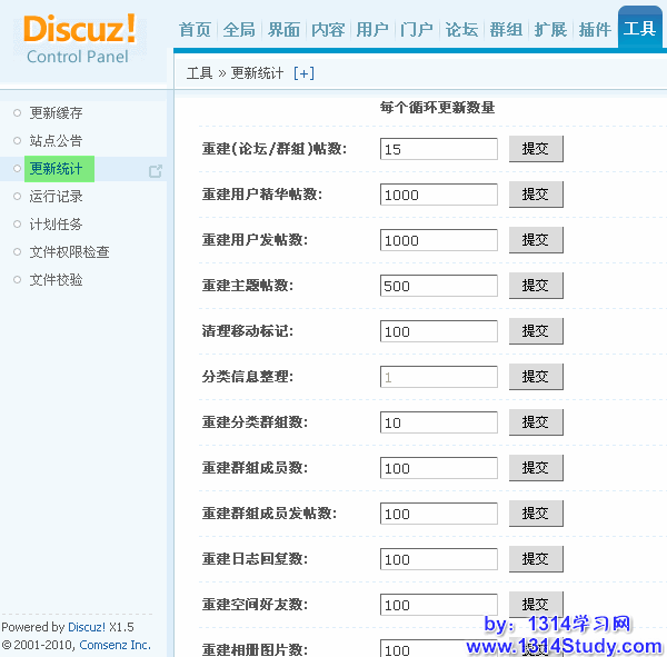 站点内的数据信息变换很频繁,比如删除帖子,发表帖子都会影响帖子总数,所以难免会出现一些统计信息和站点的实际信息不符的情况,怎样才能让站点的总体信息更为准确呢?Discuz! X1.5 的更新统计就显得尤为重要。一般在从数据库里面删除了数据之后,那就需要用到重建统计数据功能。