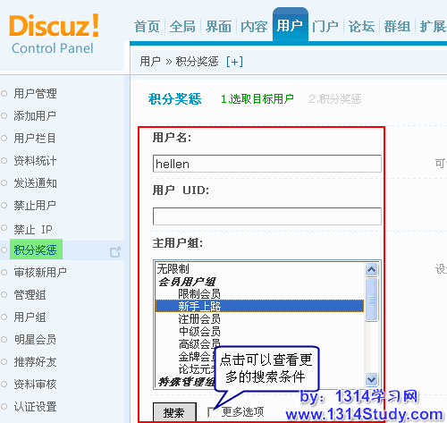 在进行积分奖惩之前,请先通过搜索,找到想要管理的用户。