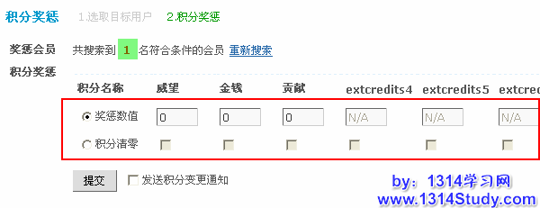 积分名称:默认有8项自定义积分,只可以改变已经启用的积分项,如上图中的威望、金钱和贡献。