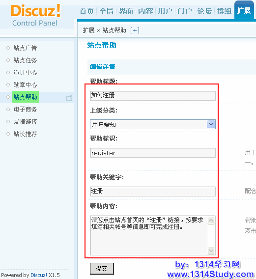 1、站长可以根据自己站点的情况,添加个性化帮助信息。添加方法是进入【后台】=>【扩展】=>【站点帮助】,如下图所示: