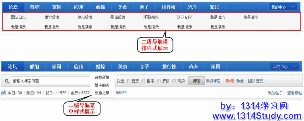 这里导航分为4种模式的:页头导航、页尾导航、家园导航、个人导航。