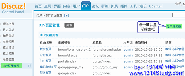 Discuz! X1.5 新增了DIY页面管理功能,当有被DIY过的页面都会显示在这里面,会根据用户的操作增加DIY页面,更加方便管理。