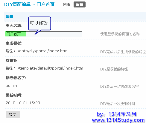 点击DIY页面列表的“编辑”链接可以修改已经生成的DIY页面名称,查看生成模板、原模板、修改者名字以及更新时间。
