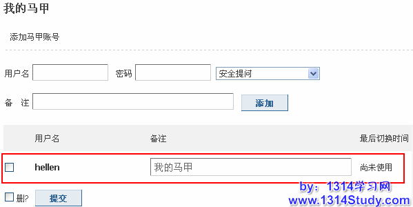 3、添加成功后,页面下方显示如图,同时在右上角的“切换马甲”下拉菜单中显示新添加的马甲账户名: