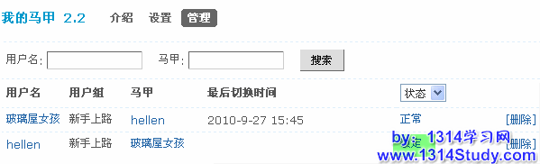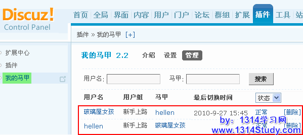 5、在后台的插件管理处选择“我的马甲”,可以查看所有的马甲设置,方便站长管理:
