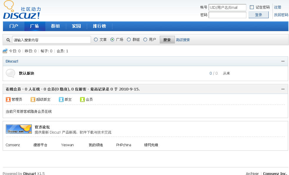 安装完毕后进入 Discuz! X1.5 首页查看网站: