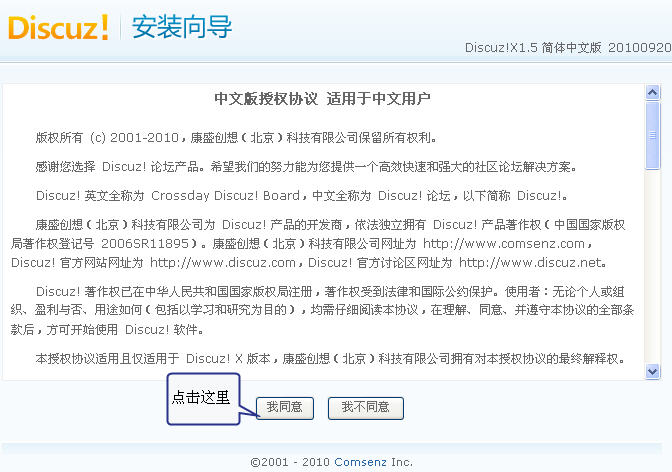 上传完毕后,开始在浏览器中安装 Discuz! X1.5,在浏览器中运行 http://www.domain.com/bbs/install/ 开始全新安装(其中 http://www.domain.com/bbs 为你的站点访问地址)