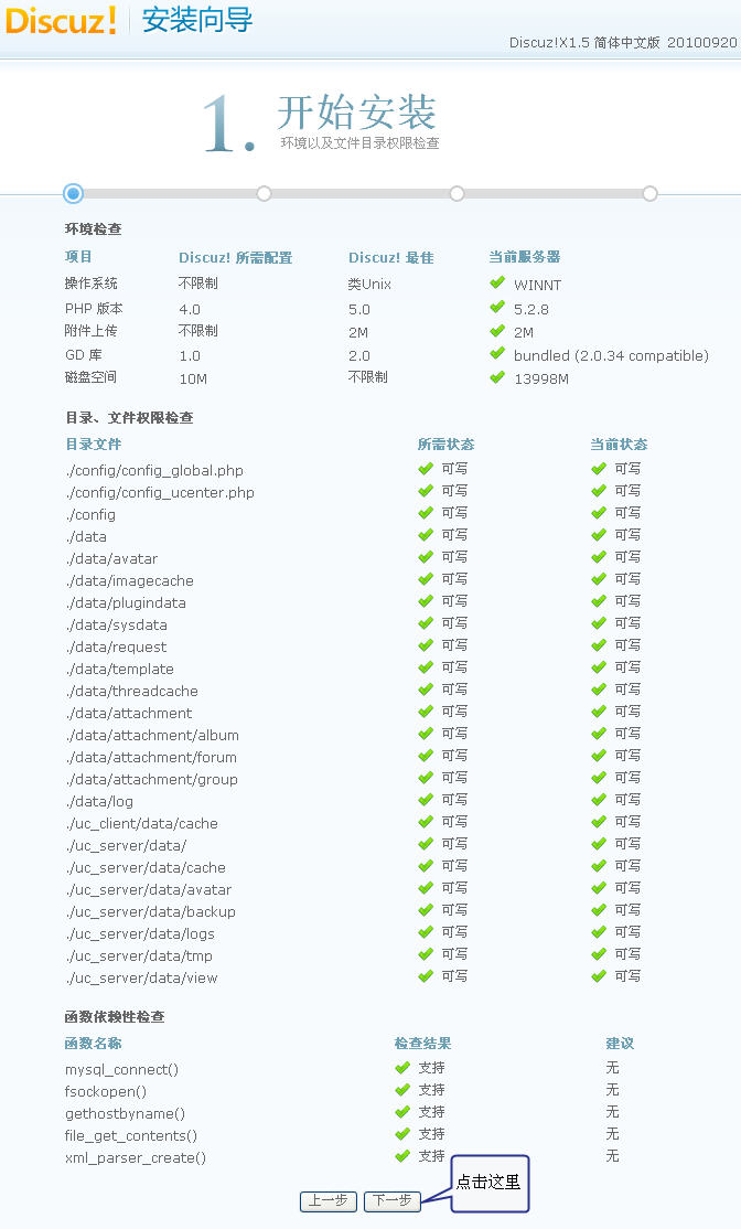 检测成功,点击“下一步”,即进入检测服务器环境以及设置 UCenter 界面,如下图所示: