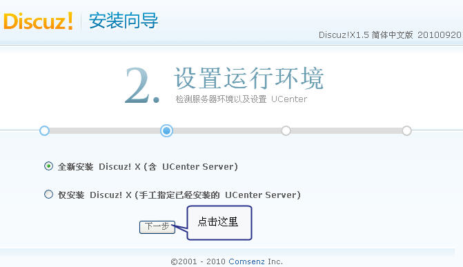 可以选择全新安装 Discuz! X (含 Ucenter Server)或者仅安装 Discuz! X (手工指定已经安装的 Ucenter Server)