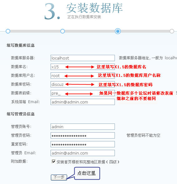 填写好 Discuz! X1.5 数据库信息及管理员信息。