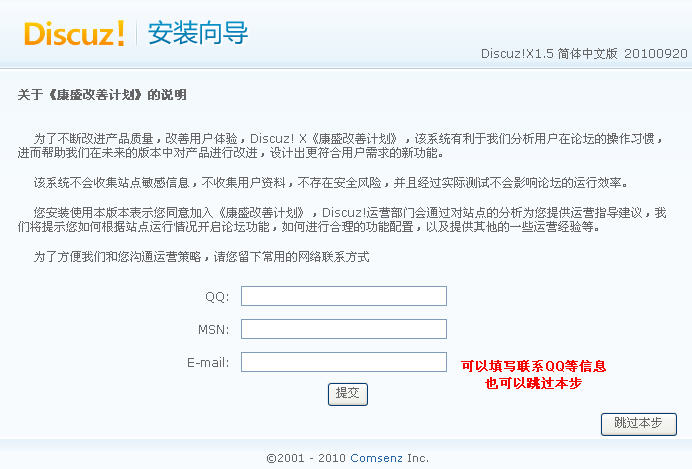 填写好联系方式后点击“提交”,也可以点击“跳过本步”直接完成安装。