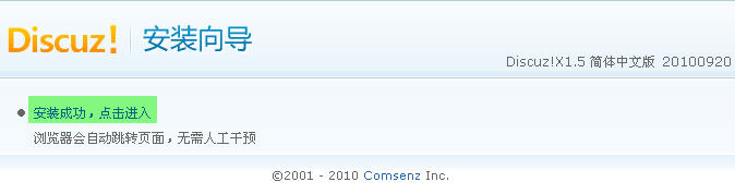 至此,Discuz! X1.5 已经成功地安装完毕!您可以登录 Discuz! X1.5 站点并开始设置了。
