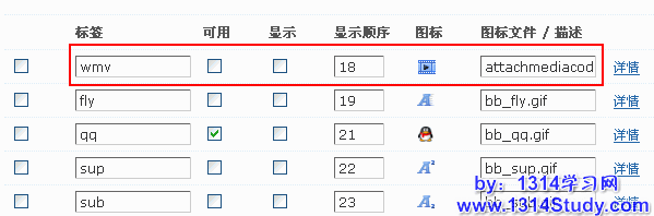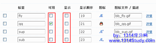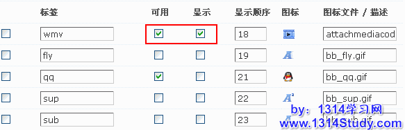 默认自带了 4 种 Discuz! 代码,可以在这里选择是否可用,是否显示,如果选择不显示那么该图标将不会显示在前台编辑器中。