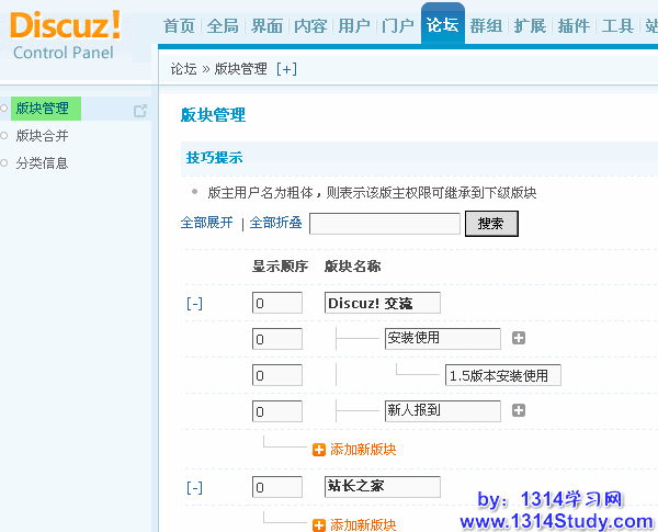 站长可以在管理后台管理论坛版块,包括添加新分区、添加新版块、添加子版块、为版块添加版主、设置版块显示顺序及编辑、删除版块等。