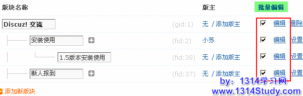 批量编辑版块,即在要编辑版块的时候,选择多个版块,然后点击批量编辑,就可以进入批量编辑界面。