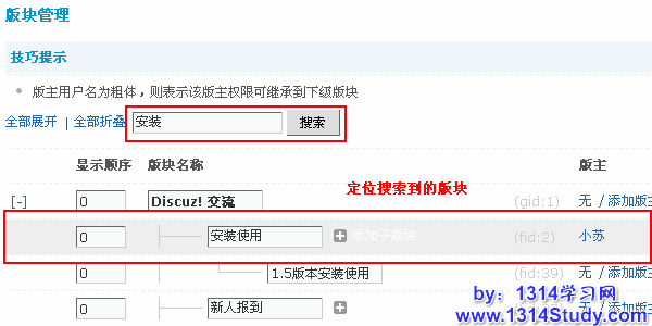 如果您的站点中版块比较多,可以使用搜索功能定位版块。