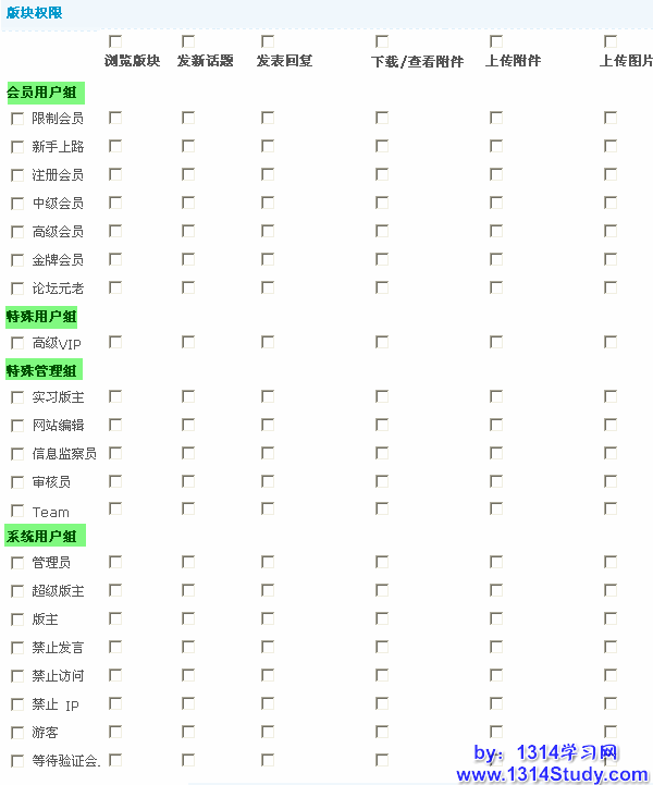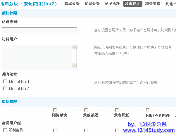 这里主要对版块的访问权限,发表主题和回复权限及附件上传和下载权限等进行设置。