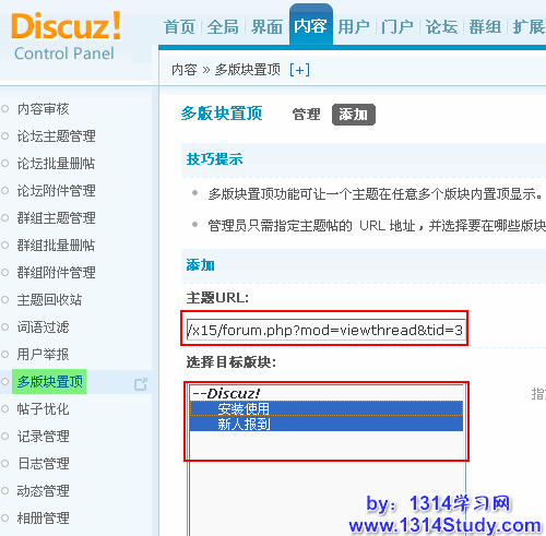 操作路径:【后台】=>【内容】=>【多版块置顶】