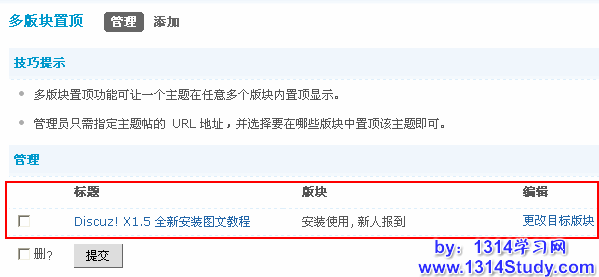 在填好主题URL和目标板块之后点击提交按钮即可完成置顶帖的添加。