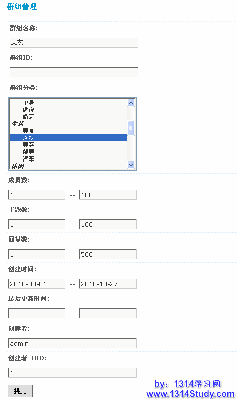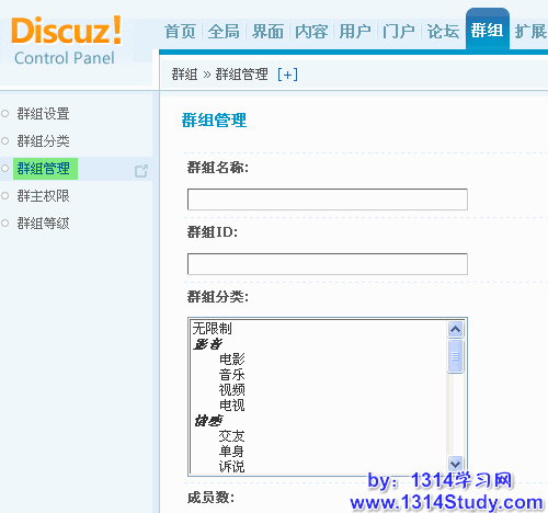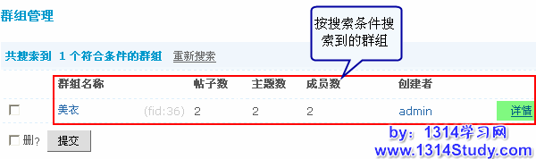 除了创建者可以在前台管理自己的群组外,管理员也可以在后台对所有已有的群组进行管理操作,Discuz! X1.5 的群组管理中,可以对群组的各项参数进行设置。