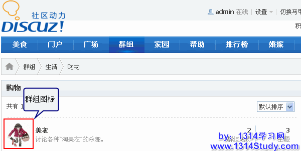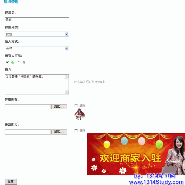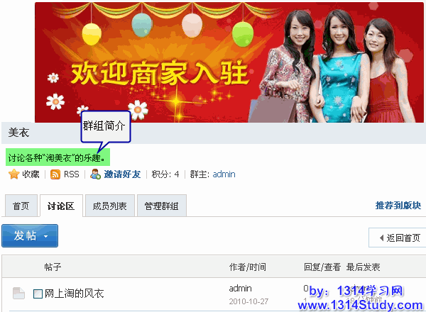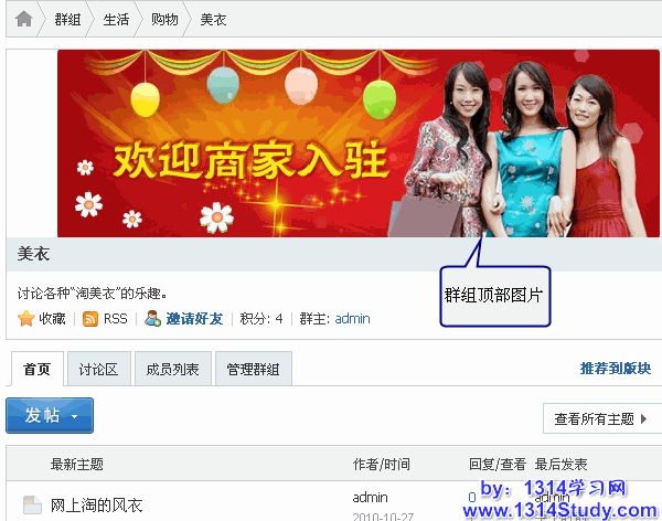 顶部图片:该群组的顶部图片,可以使群组的表现力更加丰富,用户可以选择能够体验群组特性的个性化图片装饰群组页面。在前台的显示效果为: