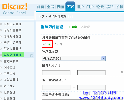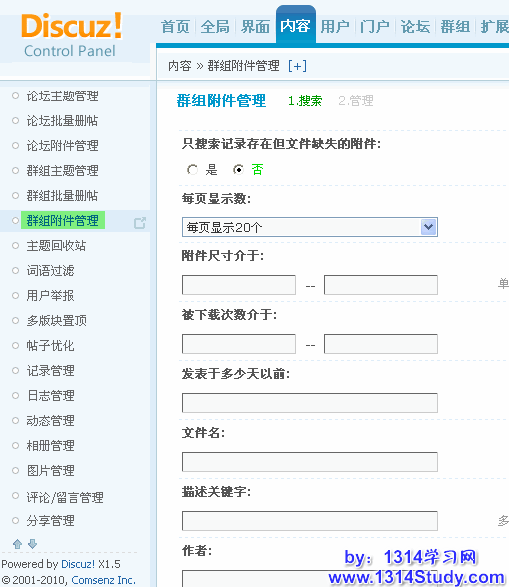 Discuz! X1.5 自带了对群组附件的管理功能。通过这个管理功能,管理员可以根据条件搜索附件,对搜索到的附件进行删除、下载、打开附件所在主题,查看附件所在路径,还可以对附件的数据表进行整理,将服务器上已经不存在的附件的信息在数据表中删除,减小附件表的数据量,进而增加附件检索的速度。