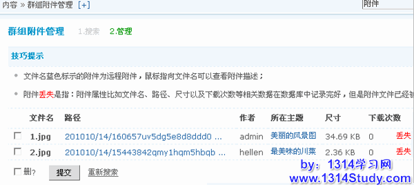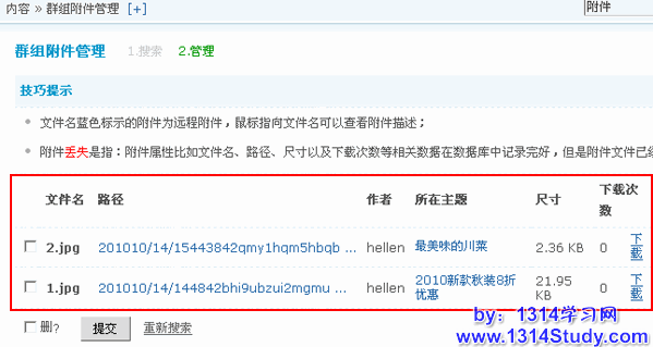 附件的管理,主要包括附件的删除、下载、查看附件所在的路径和查看附件所在主题。当按查询条件提交以后,会看到类似下图所示的搜索结果: